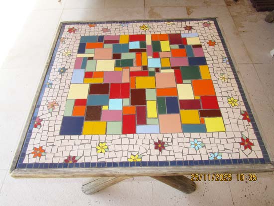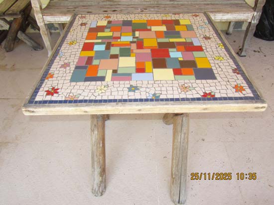 MESA BAR MOSAICO E 4 BANCOS MADEIRA