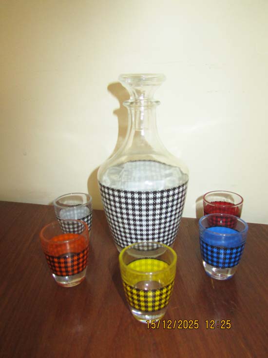 LICOREIRA E 5 COPINHOS VIDRO XADREZ