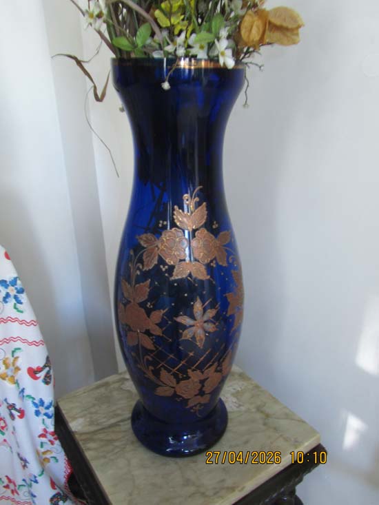 VASO ALTO AZUL VIDRO FRISO OURO