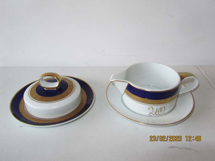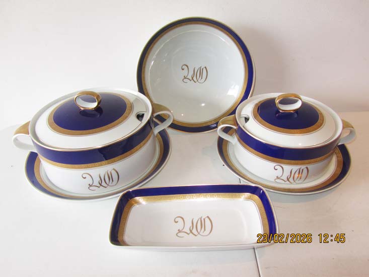 LEGUMEIRA E TRAVESSA FRISO AZUL DOURADO PORCELANA