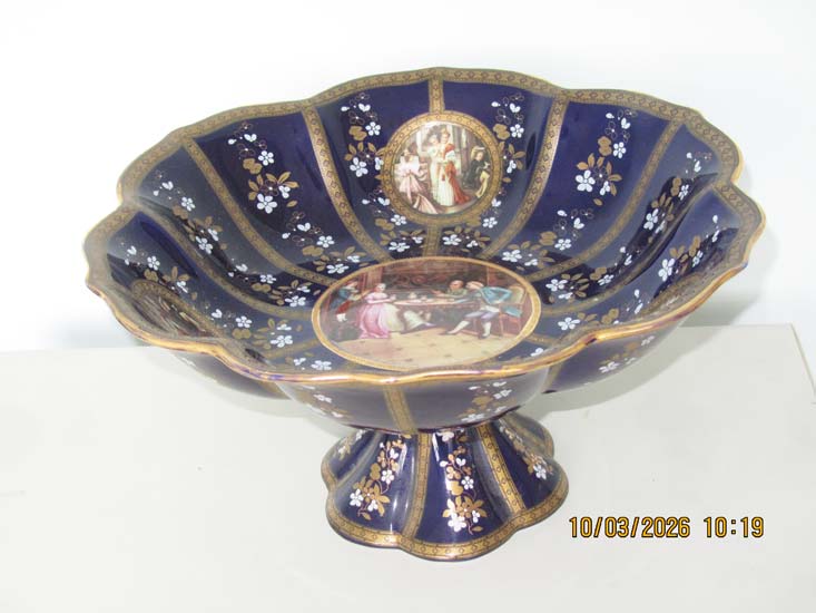 FRUTEIRA CENTRO MESA PORCELANA AZUL DOURADA COM PÉ