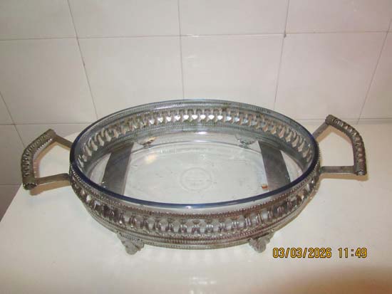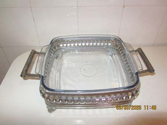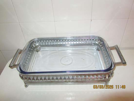 TRAVESSA INOX E PIREX COM UTENSÍLIOS
