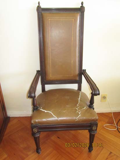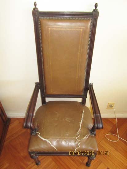 CADEIRA BRAÇO MADEIRA COURO MARROM ANTIGA ENCOSTO ALTO