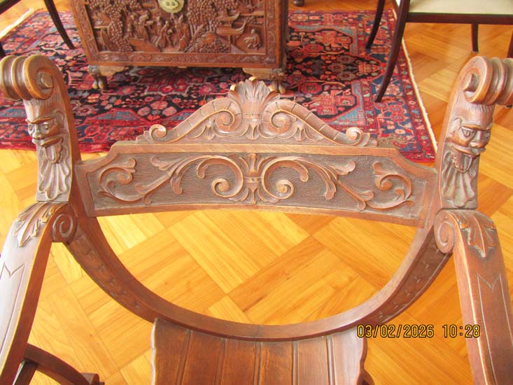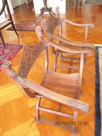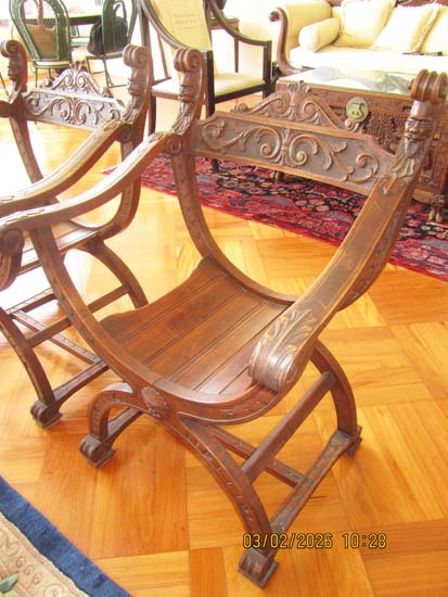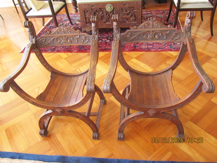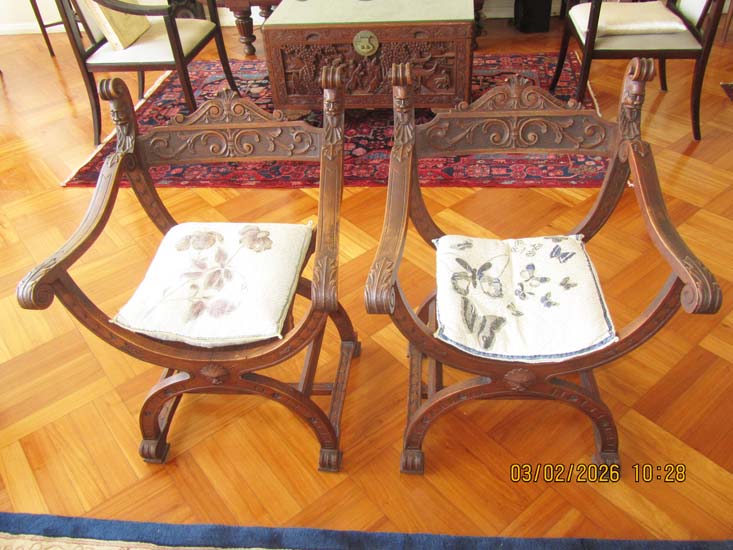 PAR CADEIRAS BRAÇO MADEIRA ENTALHE VASADAS ANTIGAS COM ALMOFADAS