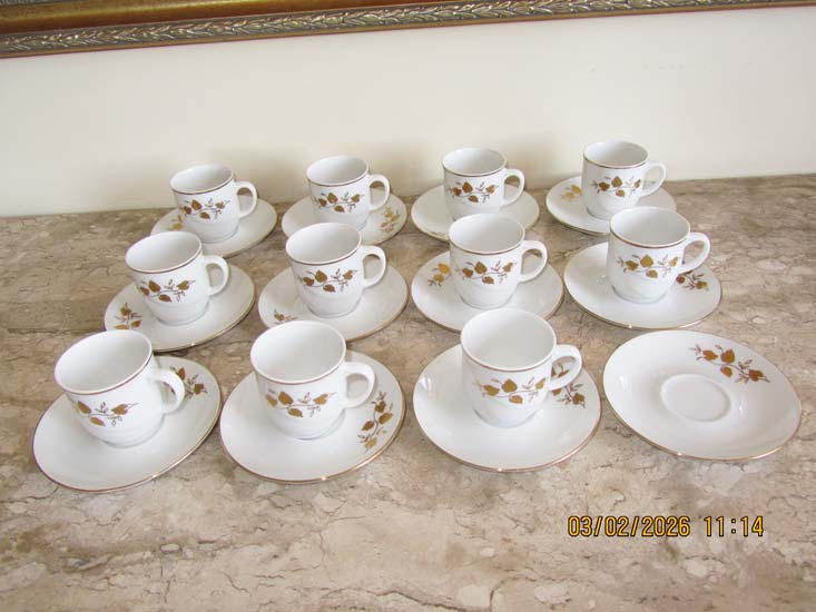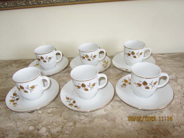 6 XÍCARAS CAFÉ E AÇUCAREIRO FOLHA OURO PORCELANA